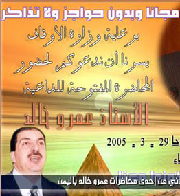 عمرو خالد يختتم جولته الدعوية باليمن.. غادر الداعية الإسلامي عمرو خالد العاصمة اليمنية صنعاء الإثنين 4-4-2005 مختتما بذلك زيارة لليمن استغرقت أسبوعا وحفلت بسلسلة من المحاضرات الدعوية. وكان خالد قد اختتم محاضراته بلقاء مجموعة من الشباب اليمني المتهمين بتبني فكر تنظيم القاعدة في محبسهم الأحد 3-4-2005، أوضح فيها مخاطر الغلو والتطرف وآثارهما السلبية على الدين والوطن، داعيا إياهم إلى "احتراف التنمية" بدلا من العنف حتى يكونوا مواطنين نافعين لدينهم وبلدهم. يذكر أن عمرو قد وصل اليمن الإثنين 28-3-2005 بدعوة من مؤسسة السعيد الثقافية بالتنسيق مع وزارة الأوقاف وذلك لإحياء عدد من المحاضرات الدينية والتوعوية في عدد من محافظات البلاد.