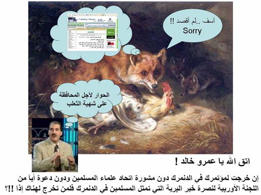 وكتب الدكتور رامي في الساحة السياسية : http://alsaha2.fares.net/sahat?128@103.WaYibps6MED.0@.2cc0a8c3 السلام عليكم ساءني أن عمرو خالد يشق صف الجماعة وهي أعظم منحة من محنة الدنمرك وبروز العلامة القرضاوي كجهة مستقلة تمثل الأمة ( بعد 80 سنة من تمزق مرجعيتهاالدينية ) تقريبا ... وحاربت ضد هذا المؤتمر الأهوج الذي صدرت فكرته من دون وحدة الأمة ومرجعيتها وعلماءها وزادني سخطاً أن اللجنة الأوربية لنصرة خير البرية لم تدع ولم تستشر فإن لم تكن فكرة مؤتمرك يا عمر خرجت من دون مشورة ومراعاة مصالح اتحاد علماء المسلمين ومن دون مشورة الشيخ رائد حليحل ومراعاة مصالح مسلمي الدنمرك فماذا بقي لك من مصالح تدافع عنها يا أستاذ عمرو سوى مصلحة الصناعة الدنمركية وقلة حياء الحكومة الصهيونية الحالية للدنمرك وكلاب اليولند بوستن؟؟